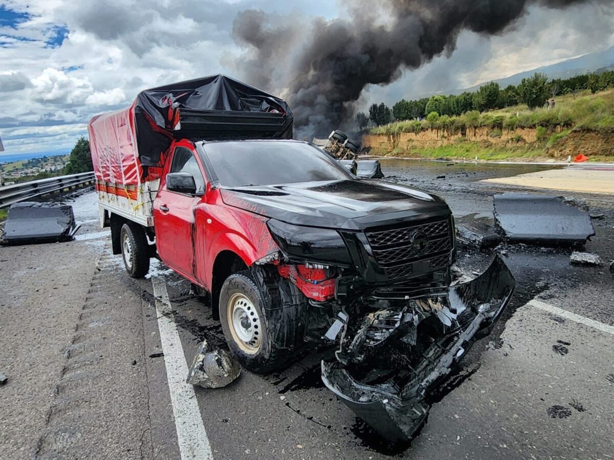 Elementos de CAPUFE, Guardia Nacional, Bomberos, Protección Civil y Policía Estatal permanecen en la zona realizando labores de enfriamiento y retiro de unidades.