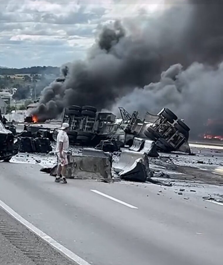 De acuerdo con los primeros reportes, uno de los conductores habría perdido el control por una posible falla en los frenos, lo que provocó la colisión; también se vieron afectados otros vehículos y el derrame del combustible que derivó en una explosión de gran magnitud.