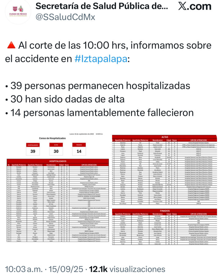 La Secretaría de Salud de la Ciudad de México actualizó el estatus de los afectados por la explosión de una pipa de gas en el Puente de la Concordia, en Iztapalapa, y confirmó que la cifra de fallecidos por la tragedia aumentó a 14 personas.