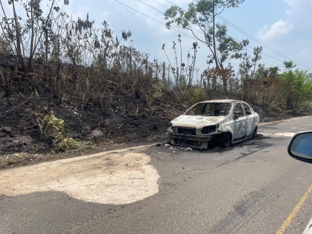 Las Choapas , Ver.Un vehículo Aveo terminó calcinado en la carretera Las Choapas–Paralelo, a pocos metros antes de llegar a la carretera federal 180 Costera del Golfo. De los tripulantes, nada se sabe, ya que la unidad permanece abandonada en el lugar.