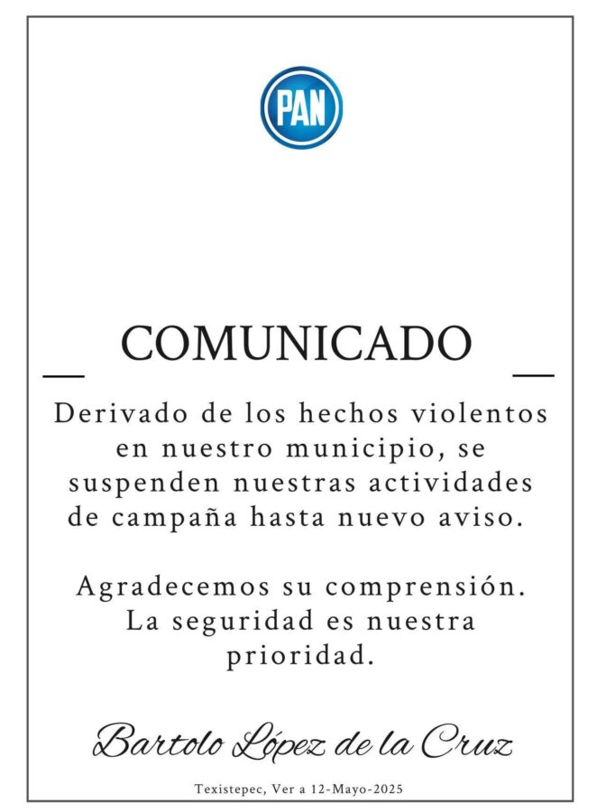 Texistepec, Ver.— Debido a los hechos violentos suscitados en Texistepec, en el sur de Veracruz, el candidato del Partido Acción Nacional (PAN) a la alcaldía de este municipio, Bartolo López de la Cruz, anunció la suspensión de sus actividades de campaña.
