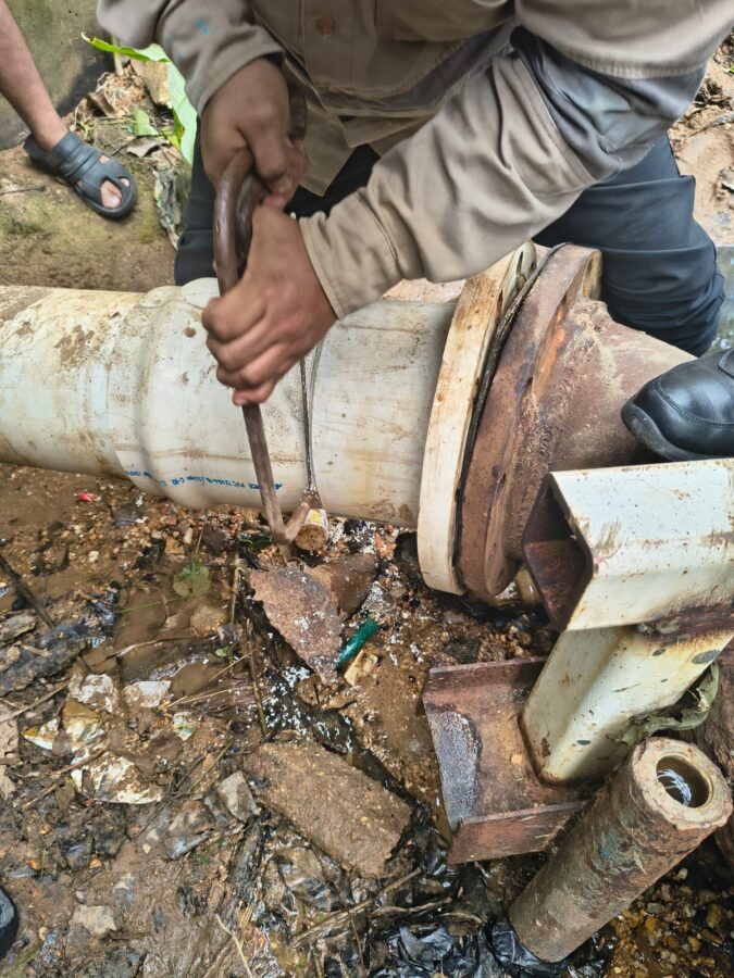 A través del personal operativo se realiza la reparación de la línea principal y sustitución de piezas dañadas que ocasionaron la fuga y el desperdicio del vital líquido.