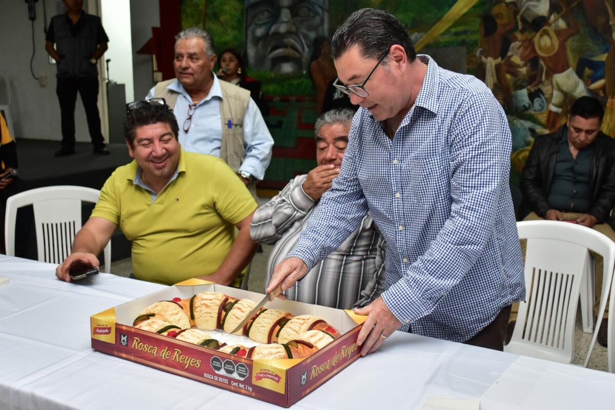 Coatzacoalcos, Ver., 8 de enero de 2025.- El presidente municipal, Amado Cruz Malpica, acompañado de la síndico único, Ana Bertha Hernández Aguilar, y de regidores, realizó la tradicional partida de Rosca de Reyes con representantes de medios de comunicación de Coatzacoalcos y les deseó un próspero año 2025.