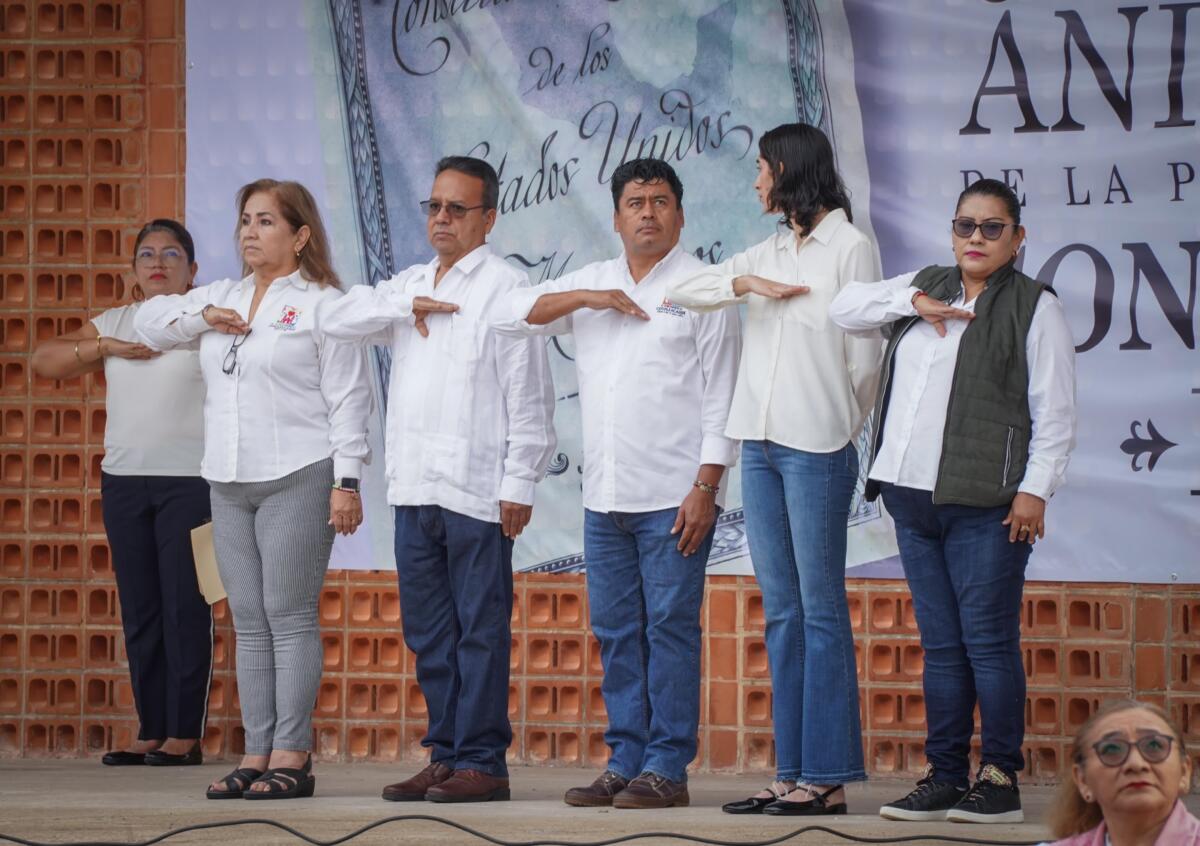 Los regidores, María de los Ángeles Pérez Dávila, José Mario Silva Aulis, Miriam del Rosario Márquez Escobar, Diana Cristina Santos Hernández y el secretario municipal del H. Ayuntamiento de Cosoleacaque, Luis Vicente González Alor fueron quienes encabezaron el acto cívico efectuado la mañana de este miércoles.