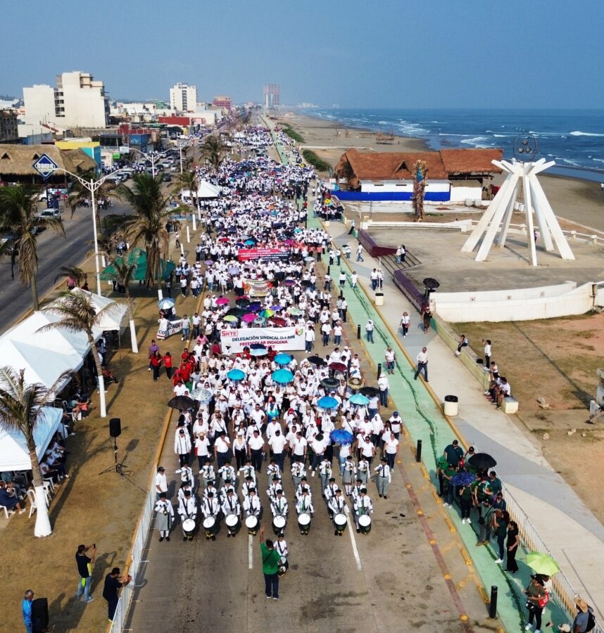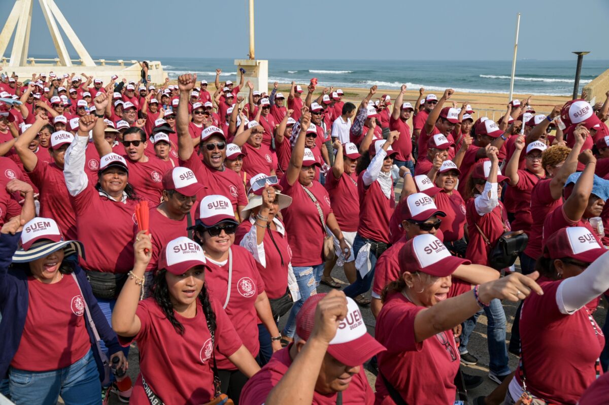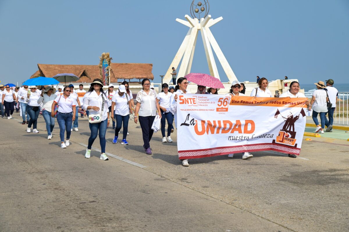 Cerca de 4 mil trabajadores marcharon con orgullo sobre el malecón costero, representando a diversos sindicatos como el SNTE sección 32 y 56, SUEM, SUTERM, SNTEA, SITICATVER, SIATEM, GNTE, SUTITESCO, SITITESCO y SUITCOBEAEV. La participación de estas organizaciones sindicales fue muestra del compromiso de los trabajadores con la defensa de sus derechos laborales y la construcción de un mejor futuro para sus agremiados y sus familias.