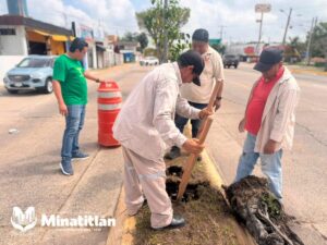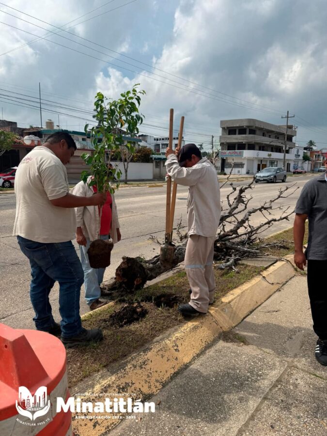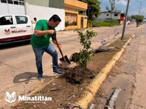 Minatitlán, Ver. — Como parte del programa permanente de reforestación urbana, el Gobierno Municipal de Minatitlán, a través de la Dirección de Medio Ambiente y Sustentabilidad, llevó a cabo la restitución de arbolado sin vida en el camellón central de la Avenida Heroico Colegio Militar, ubicada en la Colonia Petrolera.