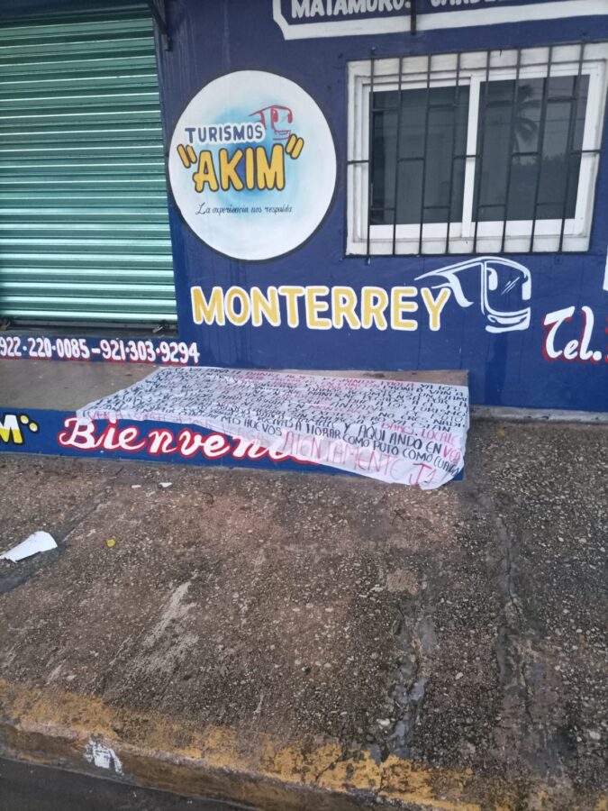 Durante la madrugada de este viernes, cuando personas no identificadas dejaron la advertencia en la entrada al negocio denominado Turismos “Akim” ubicada en Juan Osorio López número 123 de dicha colonia.
