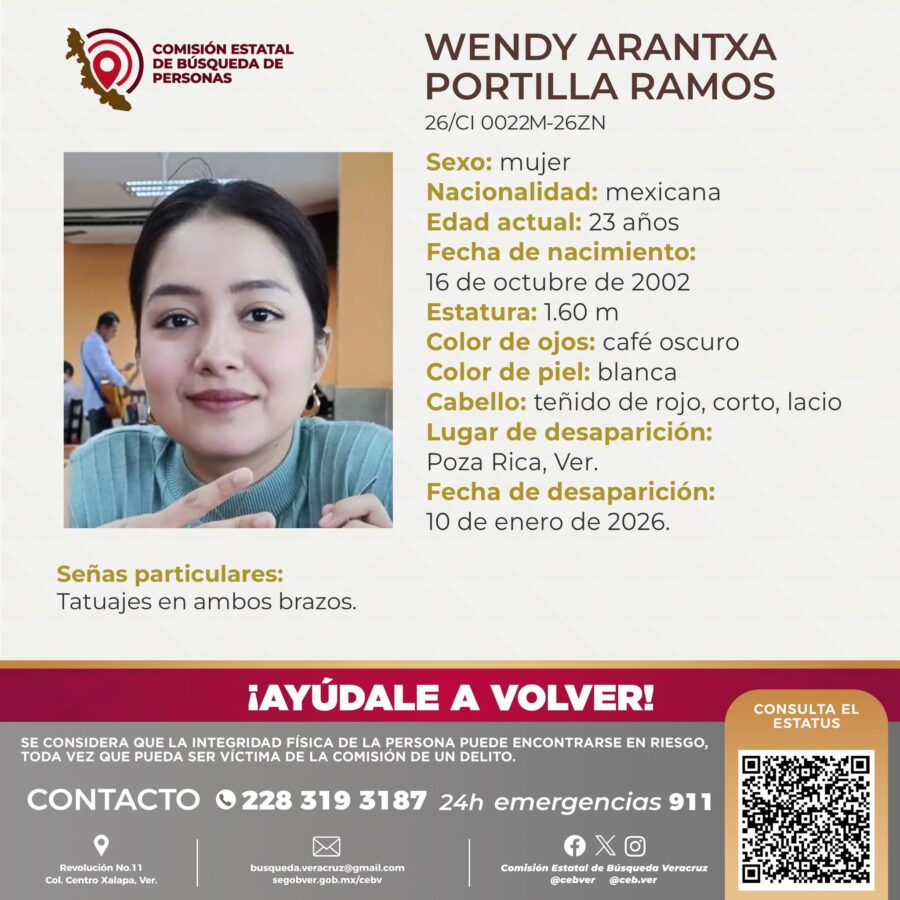 Wendy Arantxa Portillo Ramos tiene 23 años y mide 1.60 metros; tiene ojos café oscuro, piel blanca y cabello corto, lacio y teñido de rojo. Como señas particulares, tatuajes en los brazos.