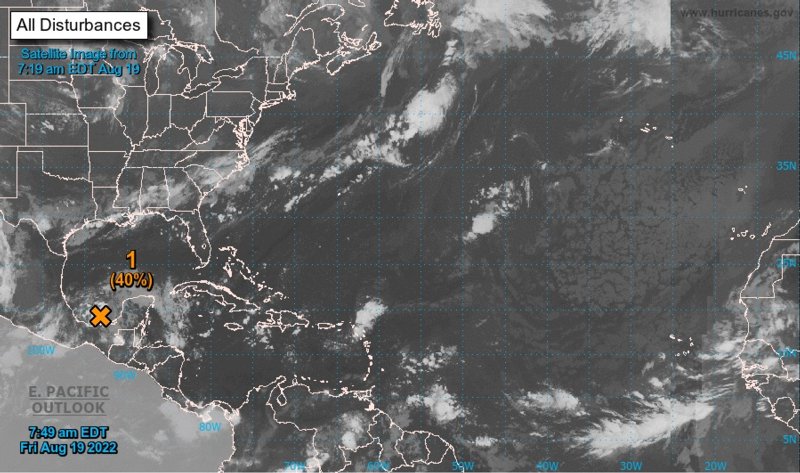 19 de Agosto del 2022.- El meteorólogo de la secretaría de Protección Civil del estado, Emmanuel Gómez informó que el disturbio tropical 99L se encuentra en aguas del golfo de México, tiene una probabilidad del 40 por ciento para que pueda convertirse en un ciclón tropical con nombre en dos días.