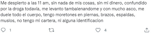 “Me despierto a las 11 am, sin nada de mis cosas, sin mi dinero, confundido por la droga todavía, me levanto tambalenandome y con mucho asco, me duele todo el cuerpo, tengo moretones en piernas, brazos, espaldas, muslos, no tengo mi cartera, ni alguna identificación”.