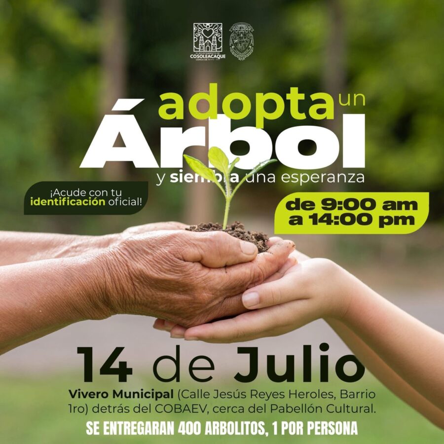 Cosoleacaque, Ver.- En el marco del día Internacional del Árbol, la dirección de Fomento Agropecuario del H. Ayuntamiento de Cosoleacaque, invita a la ciudadanía a que acuda al vivero municipal que se encuentra frente a la rueda de la fortuna, este próximo lunes 14 de junio, de 9 de la mañana a 2 de la tarde y adopte un árbol.