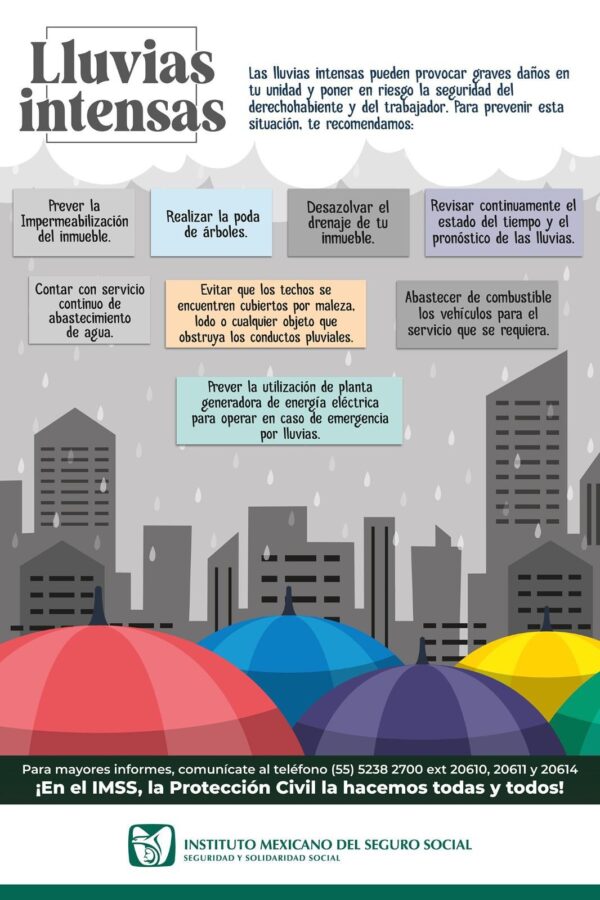 Coatzacoalcos,Ver.El Instituto Mexicano del Seguro Social (IMSS) en Veracruz Sur hace algunas recomendaciones con respecto a las temporadas de lluvia mismas que han sido fuertes y constantes, estadísticamente septiembre es el mes más lluvioso para el territorio nacional ello provoca desbordamientos de ríos, encharcamiento o alguna inundación.