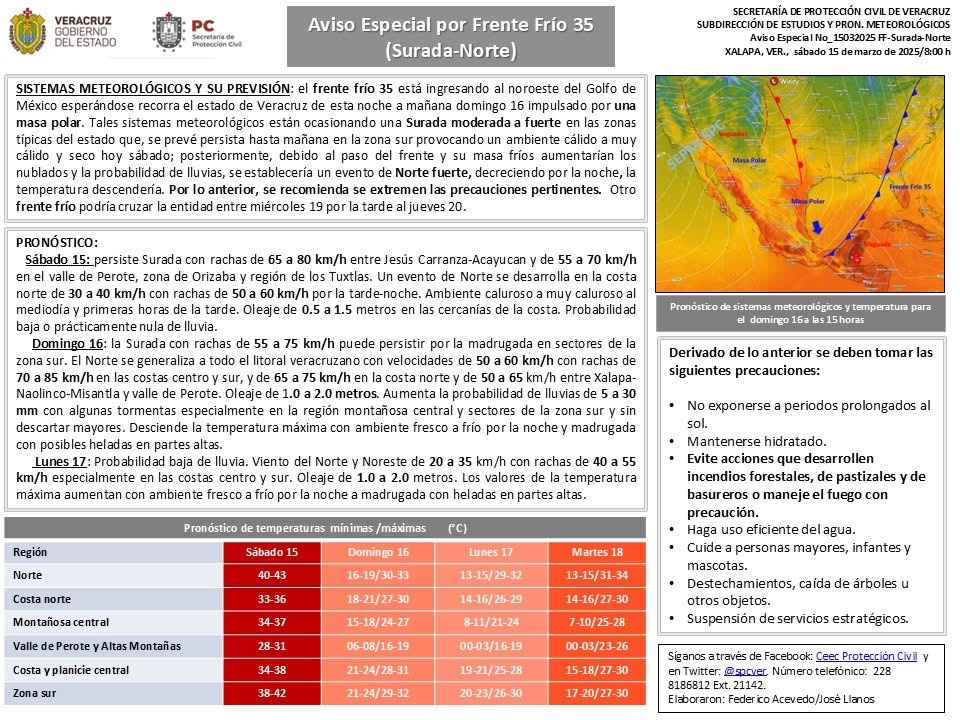 RESUMEN: El frente frío 35 está ingresando al noroeste del Golfo de México esperándose recorra el estado de Veracruz de esta noche a mañana domingo 16 impulsado por una masa polar. Tales sistemas meteorológicos están ocasionando una Surada moderada a fuerte en las zonas típicas del estado que, se prevé persista hasta mañana en la zona sur provocando un ambiente cálido a muy cálido y seco hoy sábado; posteriormente, debido al paso del frente y su masa fríos aumentarían los nublados y la probabilidad de lluvias, se establecería un evento de Norte fuerte, decreciendo por la noche, la temperatura descendería. Por lo anterior, se recomienda se extremen las precauciones pertinentes. Otro frente frío podría cruzar la entidad entre miércoles 19 por la tarde al jueves 20.