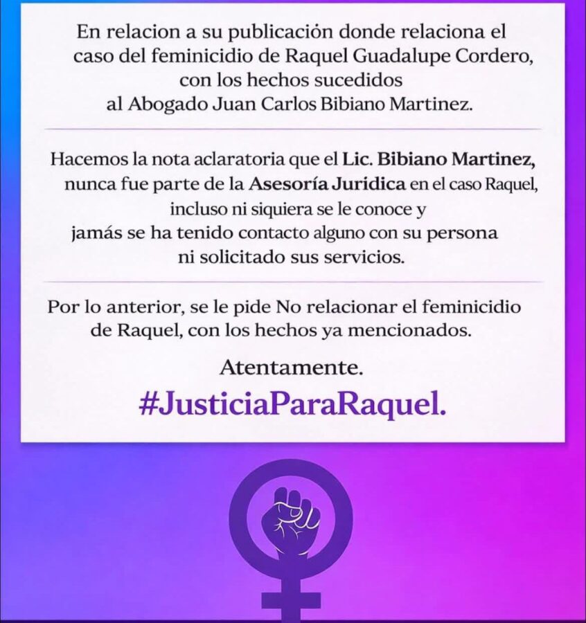 Señalaron que el feminicidio de Raquel es un proceso independiente y pidieron no difundir información incorrecta que genere confusión o desinformación, además de exigir respeto a la memoria de la víctima y a la lucha e tuvieron para que el crimen no quedara impune.