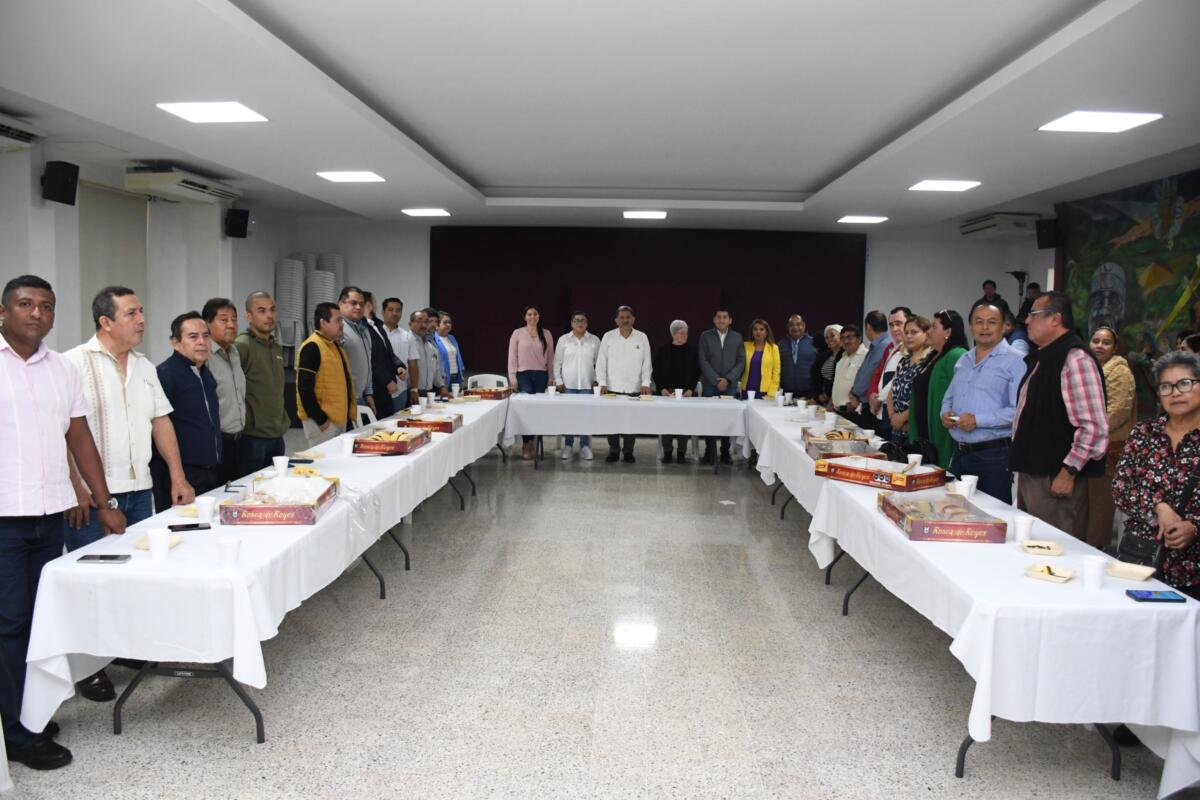 Coatzacoalcos, Ver., 09 de enero del 2024.- En un ambiente de cordialidad y unidad, el presidente municipal, Amado Cruz Malpica, sostuvo su primera reunión con el gremio magisterial en la Sala de Cabildo, donde se llevó a cabo la tradicional partida de rosca.