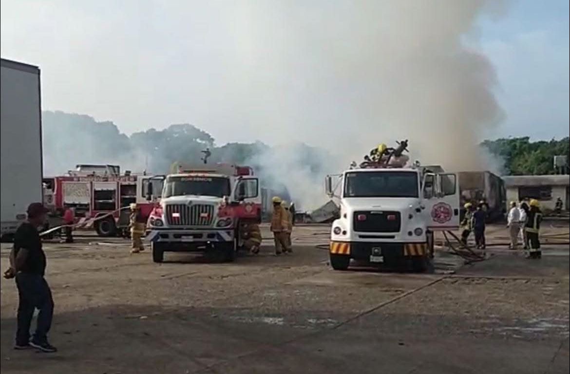 Coatzacoalcos, Ver.– Un fuerte incendio registrado la mañana de este miércoles 27 de agosto en una pensión de tráileres ubicada en el complejo Pajaritos, dentro de la zona industrial de Coatzacoalcos, consumió cinco cajas secas, un tractocamión y un remolque, esto de acuerdo con los primeros reportes.