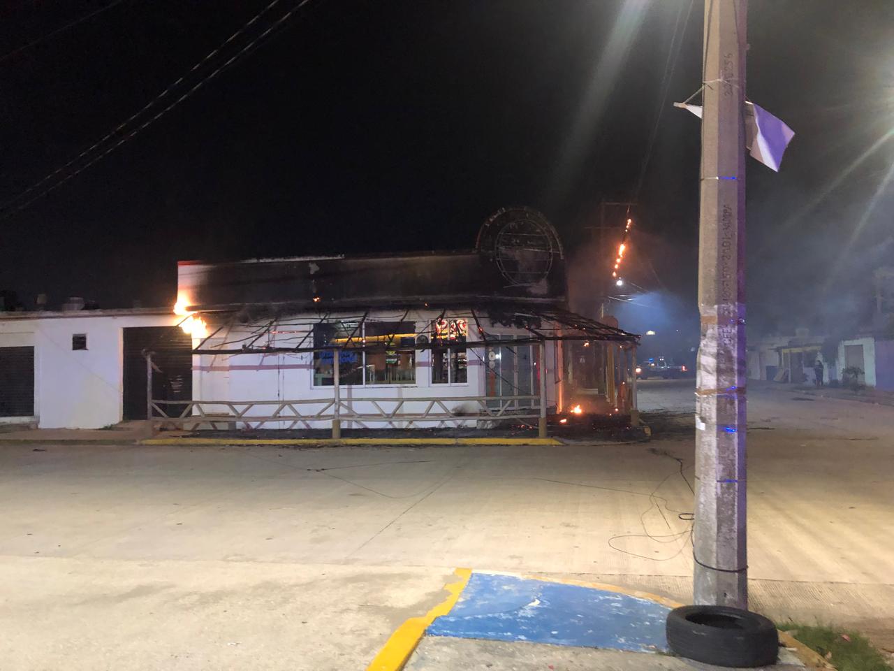 De acuerdo con testigos dos sujetos habían habrían lanzado bombas molotov en contra de la fachada de palmas del citado negocio, que se consumió en cuestión de minutos.