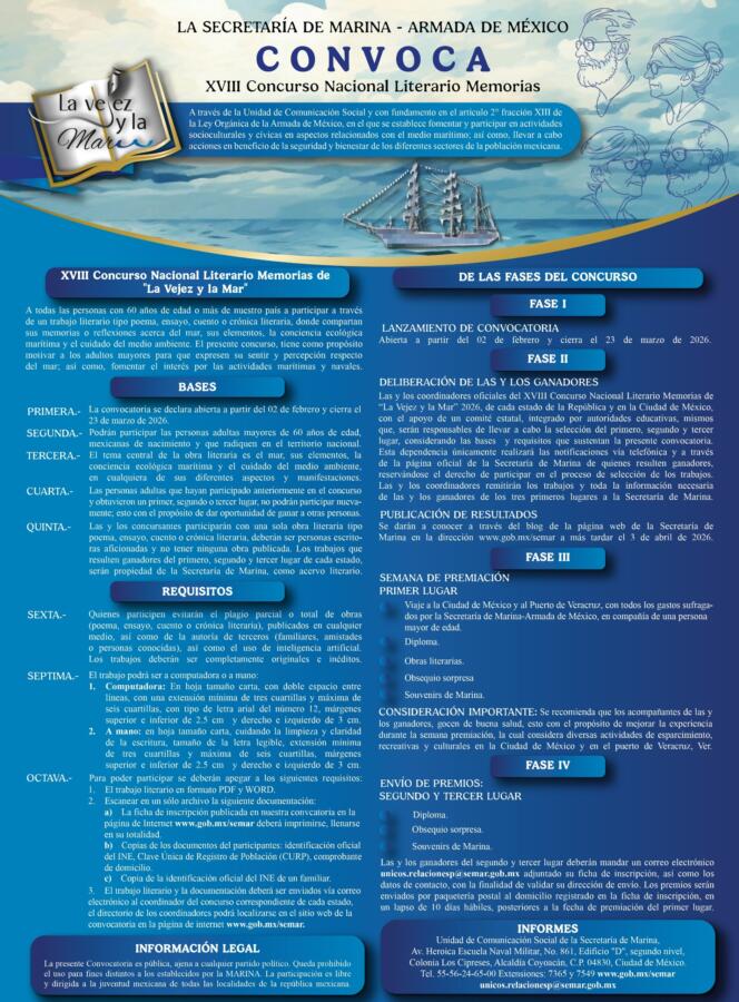 Los resultados del certamen, se publicarán a través de la página de internet de la Secretaría de Marina en la dirección www.gob.mx/semar a más tardar el 3 de abril de 2026. En esa misma dirección electrónica se encuentra la convocatoria completa.