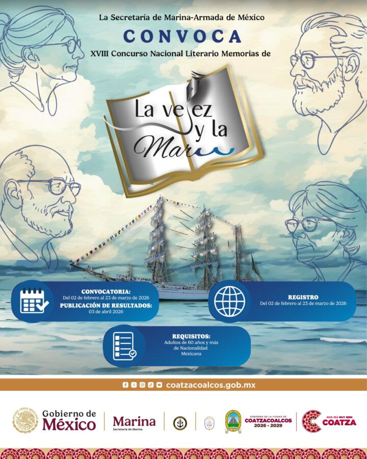 Coatzacoalcos, Ver., 12 de marzo de 2026.- El Gobierno de Coatzacoalcos que preside el alcalde, Pedro Miguel Rosaldo García, invita a las personas con 60 años de edad o más de nuestro municipio a participar en el Concurso Nacional Literario Memorias de “La Vejez y la Mar” 2026 organizado por la Secretaría de Marina-Armada de México.