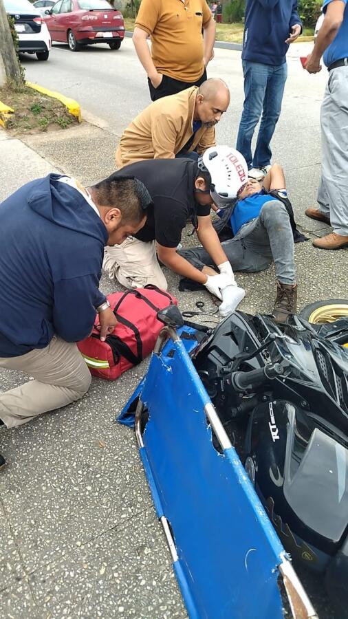 Tras la colisión, el conductor de la motocicleta resultó con una grave lesión en la pierna derecha, mientras que su acompañante presentó golpes y laceraciones en diversas partes del cuerpo.