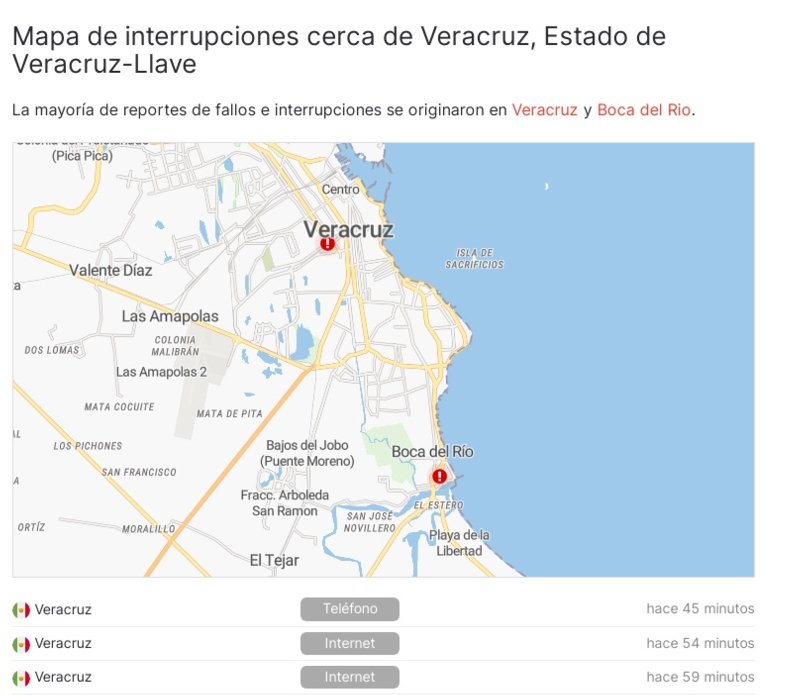A través de la página Estafallando.mx se detalla que en los últimos informes de usuarios que tienen problemas en Veracruz provienen de los códigos postales 91700, 91779, 91790, 91966, 91777, 91714, 91775 y 91780.