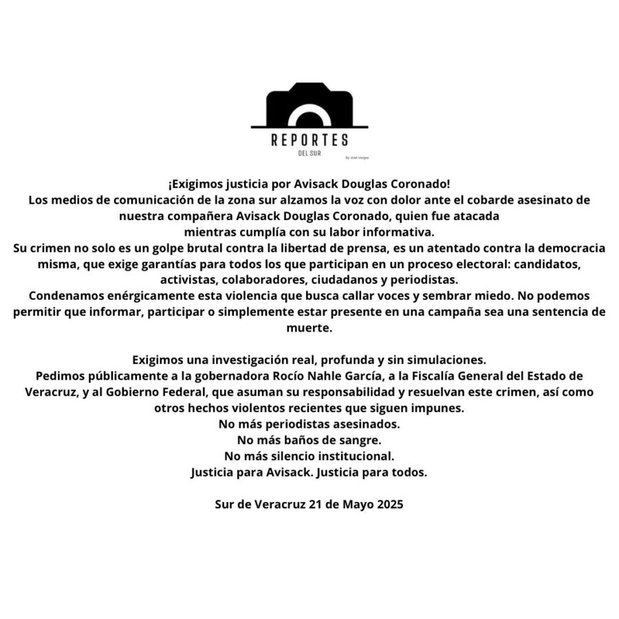 Sur de Veracruz.- En una muestra de solidaridad y protesta, reporteros del sur de Veracruz anunciaron un paro temporal en la cobertura de actividades de campaña electoral, tras el asesinato de la periodista Avisack Douglas Coronado, ocurrido el pasado 20 de mayo durante un atentado armado contra la candidata Xóchitl Tress en Juan Rodríguez Clara.