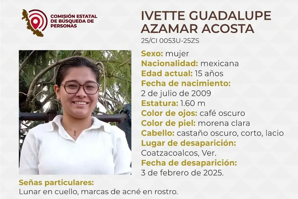 La Comisión Estatal de Búsqueda reportó la desaparición de una menor de 15 años de edad en Coatzacoalcos, al sur del estado de Veracruz.