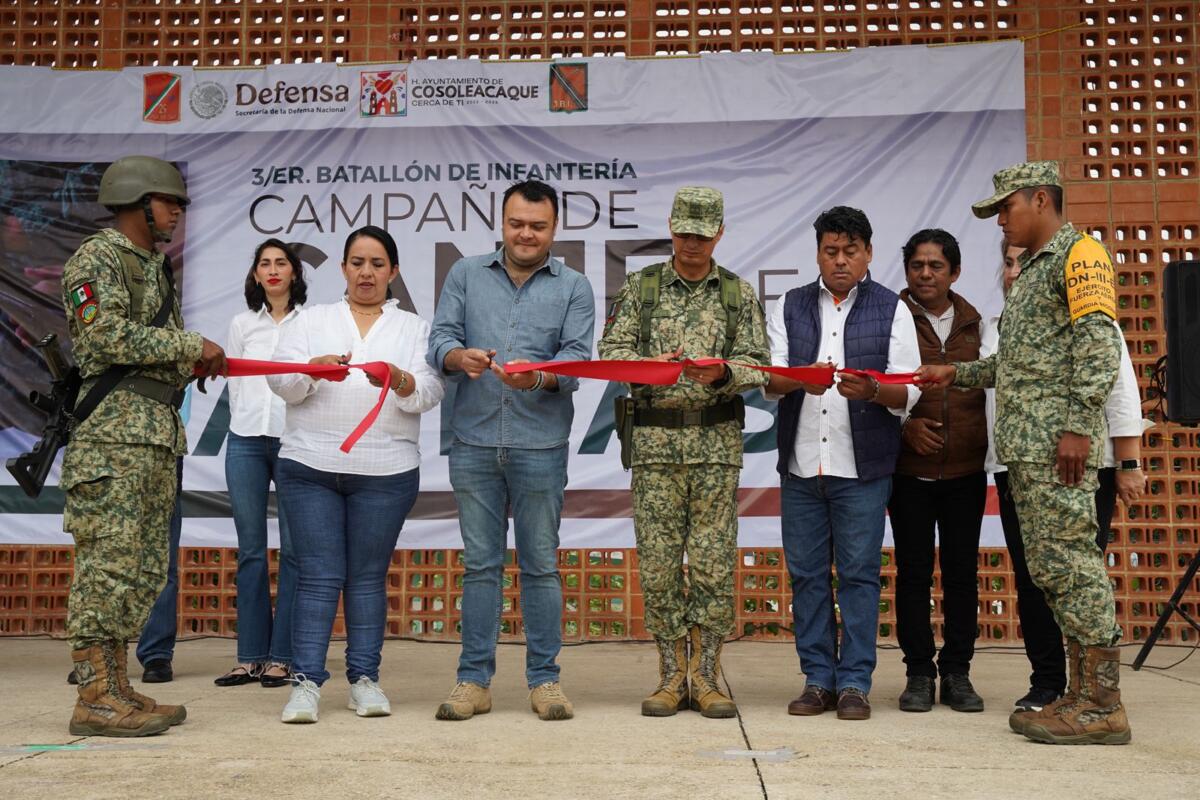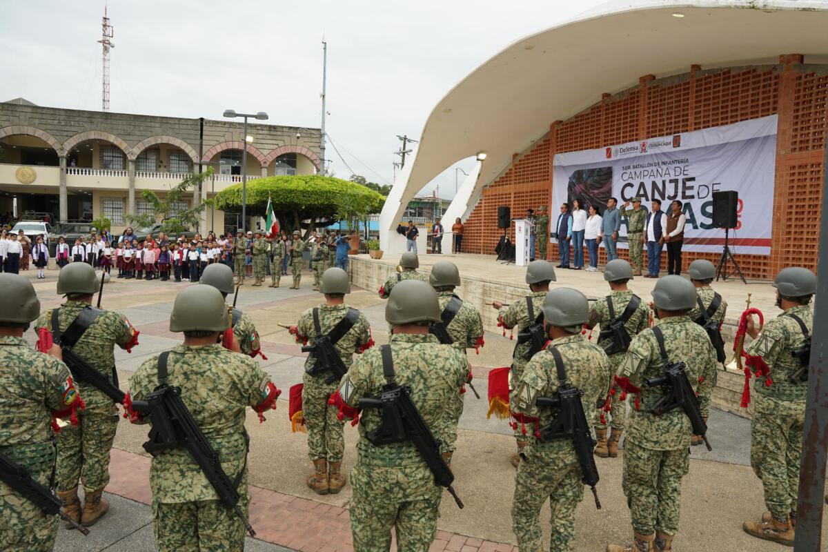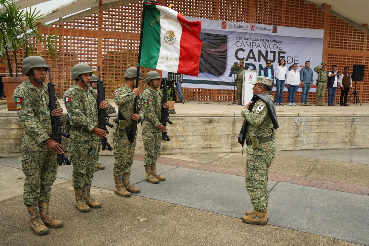 El cabildo del H. Ayuntamiento de Cosoleacaque y el teniente coronel de infantería Noe Zavala Tristán encabezaron el acto cívico en el que estuvieron presentes alumnos, maestros de diferentes instituciones educativas, elementos de la Defensa, Guardia Nacional y ciudadanía en general con quienes se rindieron los honores a la bandera, para proseguir con el corte de listón y poner en marcha el módulo de canje de armas y de proximidad social.