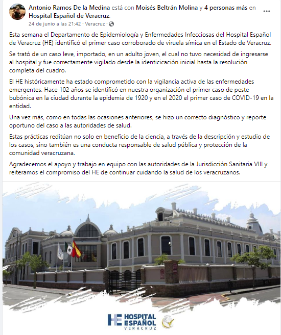 “Esta semana el Departamento de Epidemiología y Enfermedades Infecciosas del Hospital Español de Veracruz (HE) identificó el primer caso corroborado de viruela símica en el Estado de Veracruz.