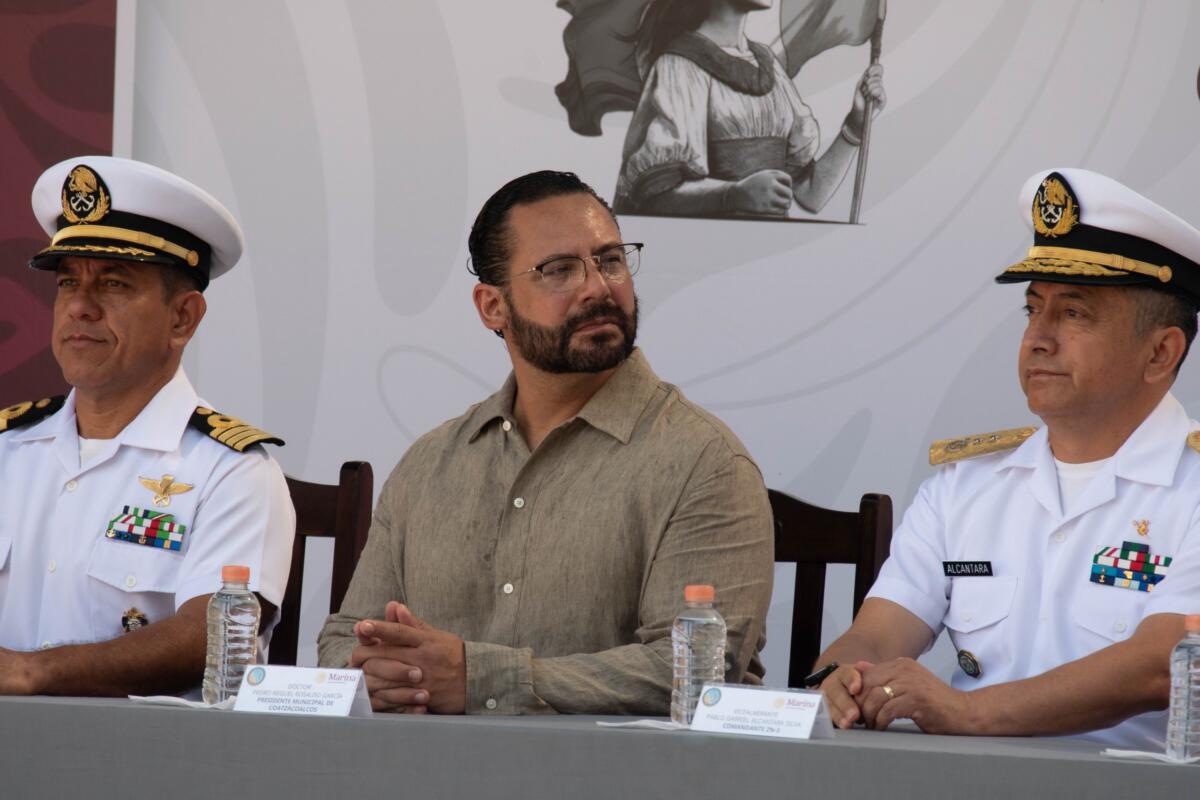 Coatzacoalcos, Ver., 28 de febrero de 2026.– El alcalde de Coatzacoalcos, Pedro Miguel Rosaldo García, acompañó al comandante de la Tercera Zona Naval, Pablo Gabriel Alcántara Silva, durante la ceremonia de bienvenida del Primer Grupo 2026 del personal de Marineros de Infantería de Marina del Servicio Militar Nacional, Clase 2007, remisos y mujeres voluntarias.