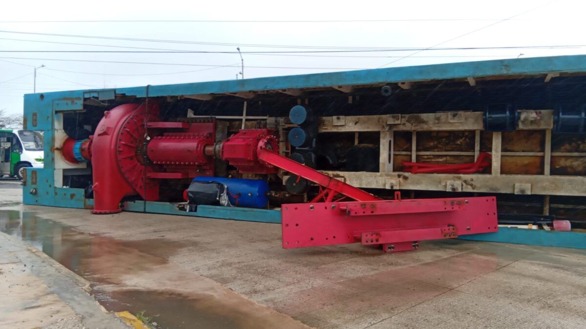 El percance se registró luego de que se rompieran las cadenas de sujeción que controlan y distribuyen el peso de la unidad, lo que provocó que la carga venciera la estabilidad del tractocamión marca Dina, tipo D9400, con placas 65-BK-4H del servicio de Transporte Federal de Carga.