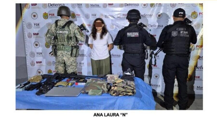 En el lugar, se logró la detención en flagrancia de Ana Laura “N”, así como el aseguramiento de hierba verde seca con características similares a las de la marihuana, teléfonos celulares, una mira, cartuchos de diferentes calibres y cargadores balísticos, identificaciones diversas, una fornitura,  un arma de fuego, ropa camuflajeada, una funda para arma de fuego, una tablet y una laptop.