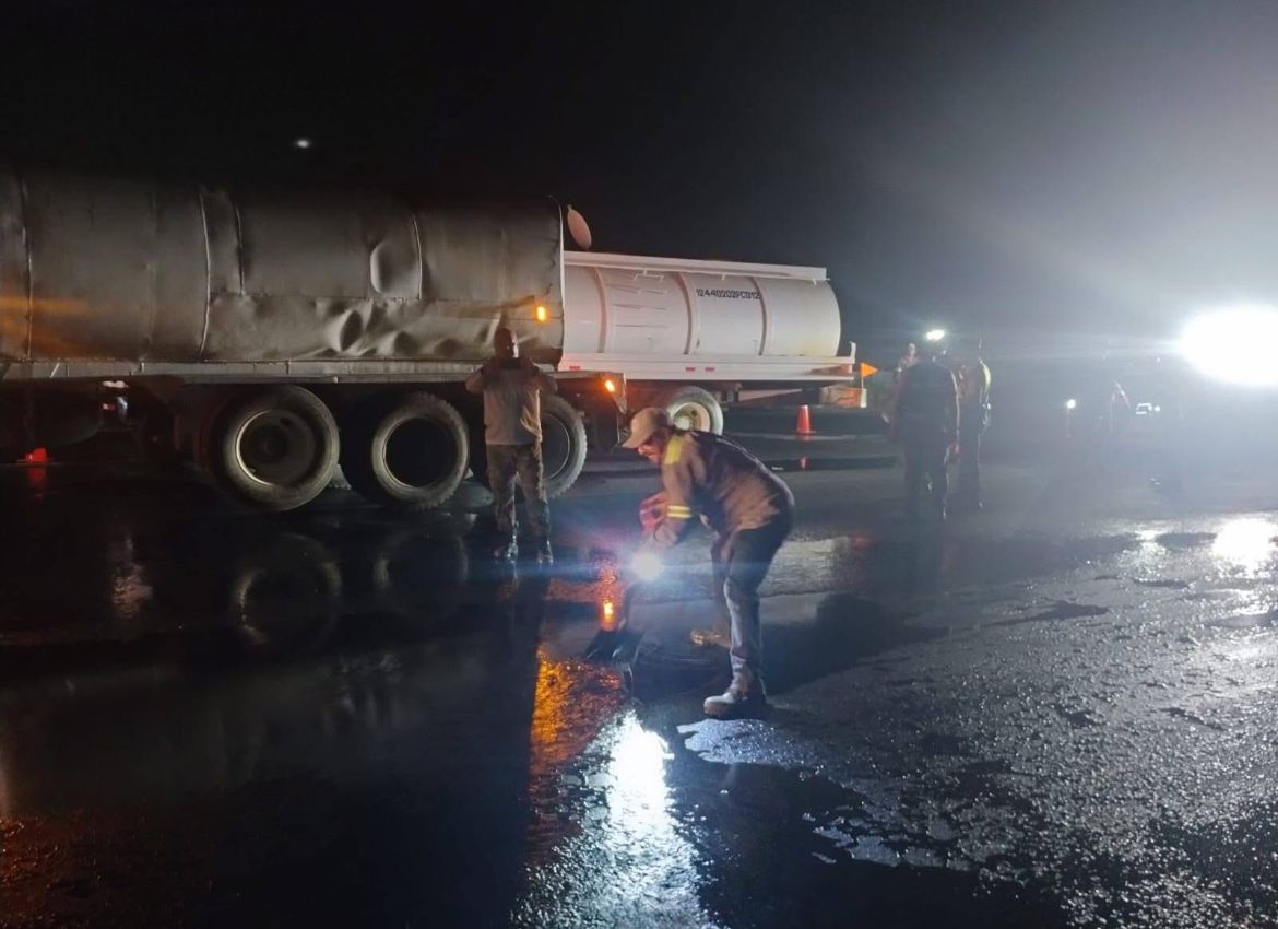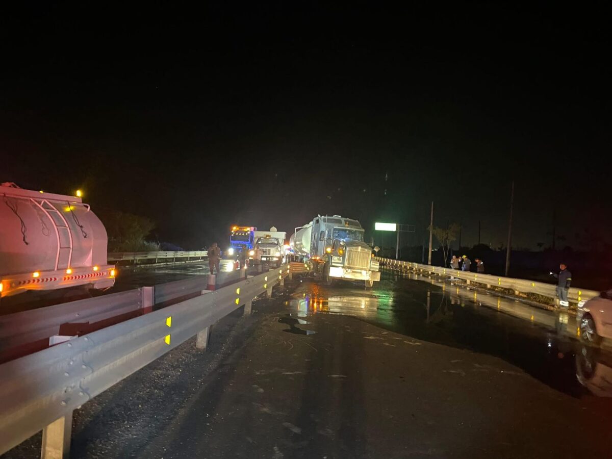 Un tractocamión que transportaba melaza volcó tras impactarse contra el barandal central de la vía, ocasionando el derrame del producto sobre la carpeta asfáltica. El conductor habría perdido el control de la unidad por causas que aún son investigadas.