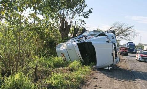 Los primeros reportes hacen saber que el exceso de velocidad aunado a una mala maniobra provocó que el chofer perdiera el control de unidad terminando volcado fuera de la cinta asfáltica.
